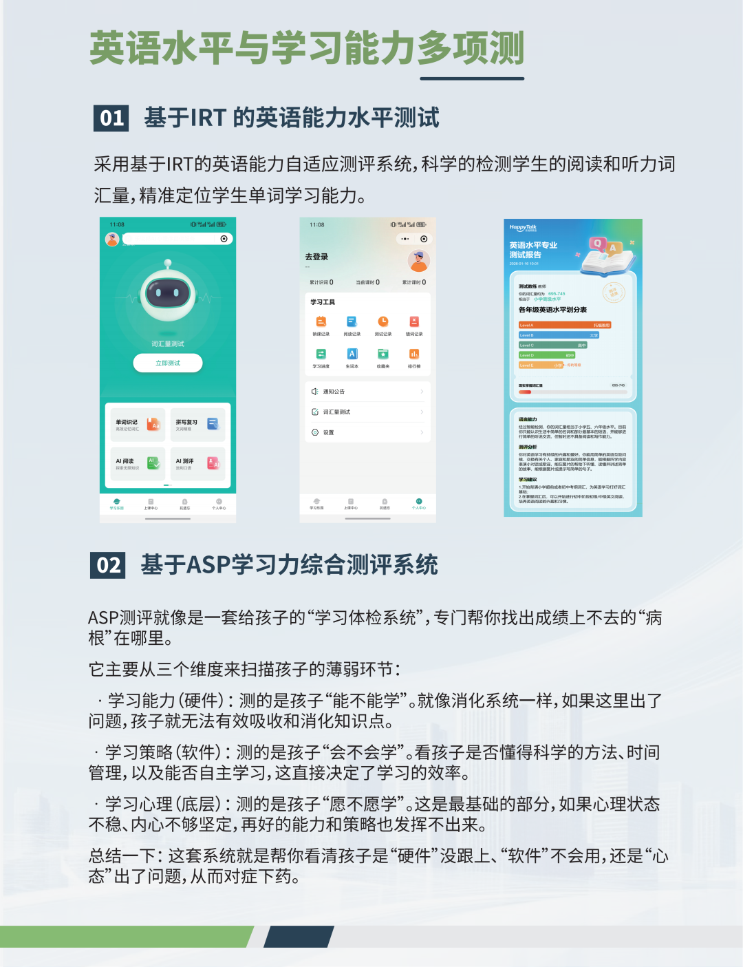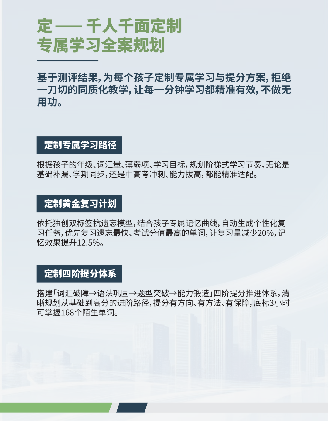 在孩子的英语学习路上,你是否也深陷这样的困境:单词背了忘、忘了背,陷入周而复始的无效循环;补课班报了一堆,钱花了、时间耗了,成绩却始终原地踏步;孩子一提英语就抵触厌学,上课听不懂、做题全靠蒙,越学越没自信;中高考临近,英语偏科成了升学路上最大的绊脚石…… 这些困扰无数家庭的英语学习难题,如今有了更科学、更高效的解决方案。深耕教育服务领域多年的英语智能提分辅导品牌 —— 考试大师外语熊,以 「AI 私教 + 真人教练」 双师模式为核心抓手,融合人工智能技术与脑科学前沿成果,打造「测→定→学→练→伴」五步全链路提分闭环,既用科技实现千人千面的个性化精准教学,又用真人陪伴赋予教育温度,用科技赋能教育,用方法破解难题,让每个孩子都能高效学好英语,轻松应对考试。 考试大师外语熊,始终以「让每个孩子都能高效学好英语,轻松应对中高考」为使命,以「用科技赋能教育,让英语学习不再困难,让每个家庭更幸福」为愿景,专注于通过 AI 技术与科学记忆算法,从根源上解决孩子英语词汇、语法、阅读、听力、口语全维度学习难题。 品牌以「AI 私教 + 真人教练」双师模式为核心,打造个性化、高效率的学习体验,始终坚守「学生第一、科技赋能教育、定制化学习路径、结果可视化」的核心价值观,秉持「教育有道、育人有心、提分有法、教子有方、成长有迹、未来有望」的教育理念,多年来凭借扎实的教学效果与完善的服务体系,赢得了万千家庭的认可,致力成为中国家庭信赖的英语提分品牌。 不同于市面上单一的单词速记产品、碎片化的课程教学,考试大师外语熊以「测→定→学→练→伴」五步闭环为核心,打造了从入学测评到考前冲刺的一站式英语提分全体系,形成了可落地、可追溯、可保障的完整提分逻辑。 拒绝盲目学习、一刀切教学,考试大师外语熊以两大权威测评体系为核心,30 分钟即可全面摸清孩子的真实英语水平与学习瓶颈,为个性化学习找准根源、锚定方向。 其中,IRT 自适应英语能力测评,基于项目反应理论打造,能科学检测学生的阅读和听力词汇量,精准定位当前英语能力层级,误差控制在十位级,为孩子锁定最适配的学习起点; ASP 学习力综合测评,则从学习能力、学习策略、学习心理三个维度,全面扫描学生的薄弱环节,精准找出成绩上不去的「病根」,真正实现对症下药、靶向提升。 基于科学测评结果,考试大师外语熊为每个孩子定制专属的学习与提分全案,彻底告别同质化的一刀切教学,让孩子的每一分钟学习都精准有效,不做无用功。 针对不同孩子的年级、词汇量、薄弱项与学习目标,品牌会定制阶梯式的专属学习路径,无论是基础补漏、学期同步,还是中高考冲刺、能力拔高,都能精准适配; 依托独创的双标签抗遗忘模型,结合孩子的专属记忆曲线,自动生成个性化黄金复习计划,优先复习遗忘最快、考试分值最高的单词,让复习量减少 20%,记忆效果提升 12.5%; 同时搭建「词汇破障→语法巩固→题型突破→能力锻造」四阶提分推进体系,清晰规划从基础到高分的进阶路径,让提分有方向、有方法、有保障。 以八大核心黑科技为支撑,考试大师外语熊打造了六维一体全能力课程体系,同时遵循「会认、会读、会听、会写、会用」五项全能教学标准,从根源上夯实孩子的英语基础,实现综合能力全面提升。 在课程设置上,品牌打造了覆盖英语学习全场景的六大核心模块: 智能单词课程以独创抗遗忘引擎,破解单词记不住的核心难题,覆盖小初高全阶段教材同步词库与中高考高频词库; 智能句型课程通过 200 + 核心句型专项训练,培养孩子语感,为阅读写作筑牢基础; 智能语法课程以闯关式学练测闭环,帮助孩子系统化攻克语法难关; 智能阅读课程基于孩子词汇量精准分级,AI 智能推荐时文与真题文章,词文结合提升阅读理解与解题能力; 智能听力课程结合抗遗忘引擎设计阶梯式训练,精准贴合中高考听力要求; 智能口语课程通过 AI 实时语音评测,逐词纠正发音,帮助孩子练就地道口语。 八大核心黑科技全程为学习保驾护航,从海马 LTP 技术、双标签抗遗忘模型,到多感官记忆技术、抗疲劳兴奋诱导技术,再到 AI 分级阅读系统、24 小时 AI 辅学交互系统,全方位破解记忆难题,提升学习效率;同时以「认、读、听、写、用」五步闭环标准化教学流程,确保每个单词都能被孩子真正掌握、灵活运用,让英语能力实现全方位进阶。 拒绝盲目题海战术,考试大师外语熊打造七步模块晋升学习法,形成完整训练闭环,让练习精准靶向孩子的薄弱项,真正实现学以致用、稳步提分。 品牌严格遵循「识记→复习→阅读复训→专项训练→模拟测试→错题攻坚→提分冲刺」的七步训练路径,融合心流理论、限时记忆、间隔重复等科学学习原理,让孩子实现沉浸式学习、系统性训练。 设计词义闯关、听写默写、听力阅读专项等多梯度题型,由浅入深引导孩子在黄金记忆节点主动回想,强化记忆效果 系统自动归集孩子的错题盲区,针对易错点、易混点、高频失分点推送专项强化训练,把每一个失分点都变成得分点 同时融入积分、金币、PK、闯关等趣味设计,把枯燥的刷题变成趣味挑战,让孩子从被动练习变为主动挑战,彻底扭转厌学情绪,唤醒学习内驱力。 好的教学效果,离不开专业的陪伴与监督。 考试大师外语熊打造「AI 私教 + 真人教练