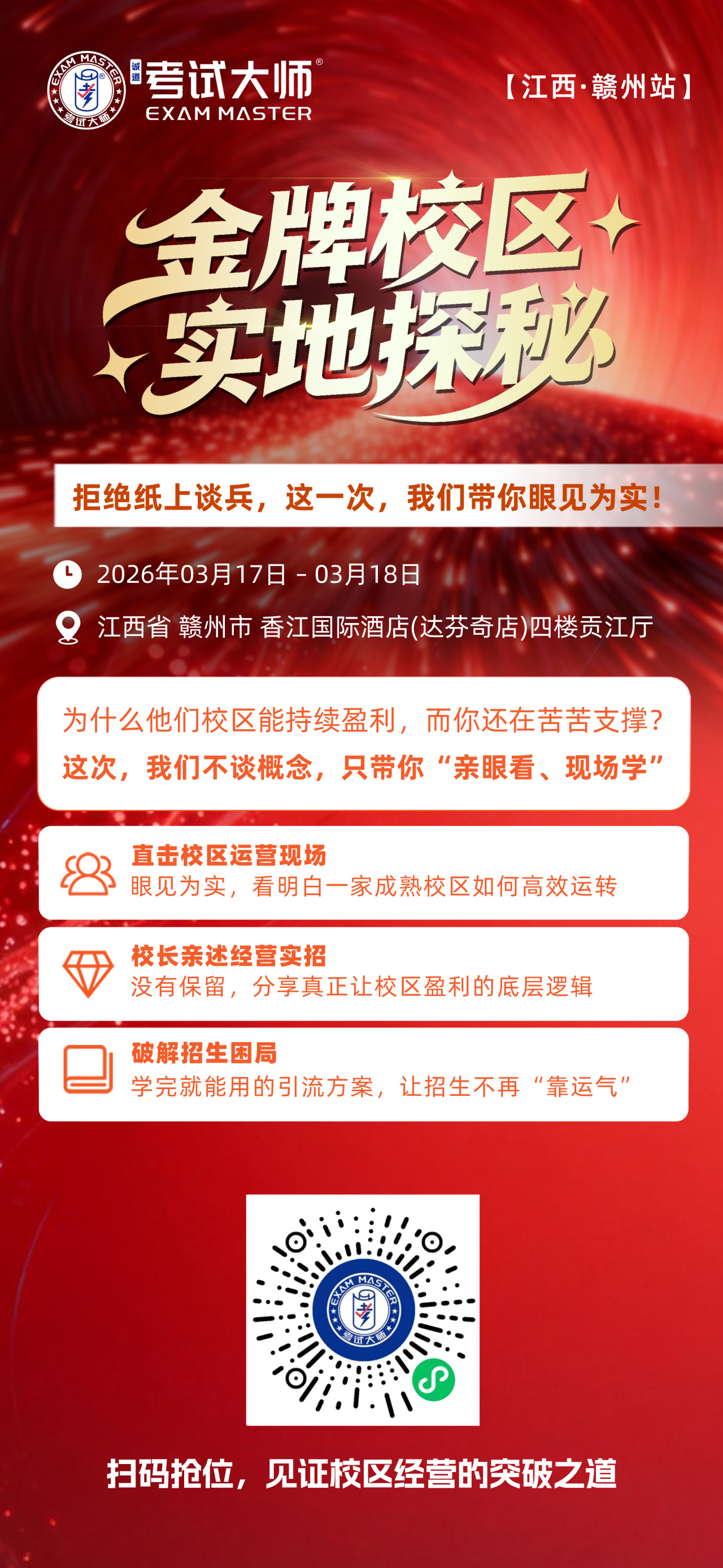 每一站,我们走进校区、直面数据、对话校长;每一场,我们用“眼见为实”的方式,让盈利逻辑从理论走向落地。2026年3月17日-18日,第四站即将挺进江西赣州——这一次,我们把被验证的增长密码,带到你面前